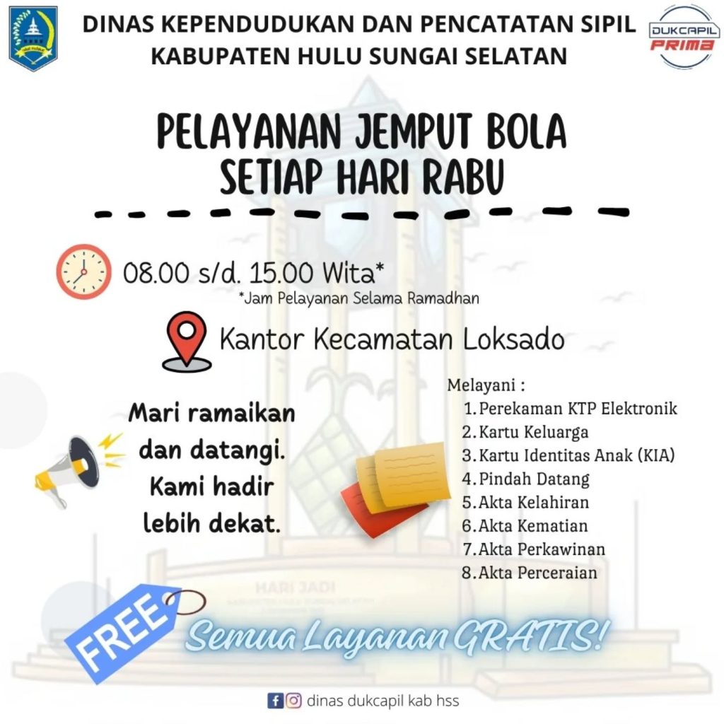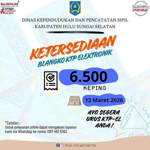 Pelayanan khusus selama libur nasional dan cuti bersama Hari Raya Idul Fitri 1447 H pada hari Selasa tanggal 24 Maret 2026, Dinas Dukcapil Kab. HSS tetap buka dalam memberikan pelayanan adminduk, yang berlokasi di dua tempat, yaitu :