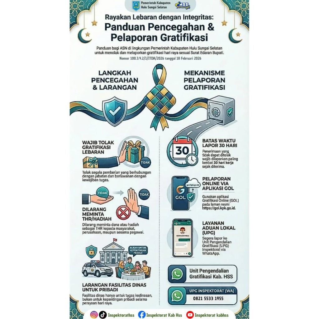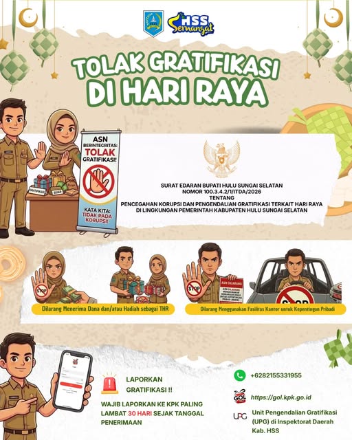 Sesuai dengan Surat Edaran Bupati HSS No 100.3.4.2/1/ITDA/2026 tentang Pencegahan Korupsi dan Pengendalian Gratifikasi Terkait Hari Raya di Lingkungan Pemerintah Kabupaten Hulu Sungai Selatan yang berisi :