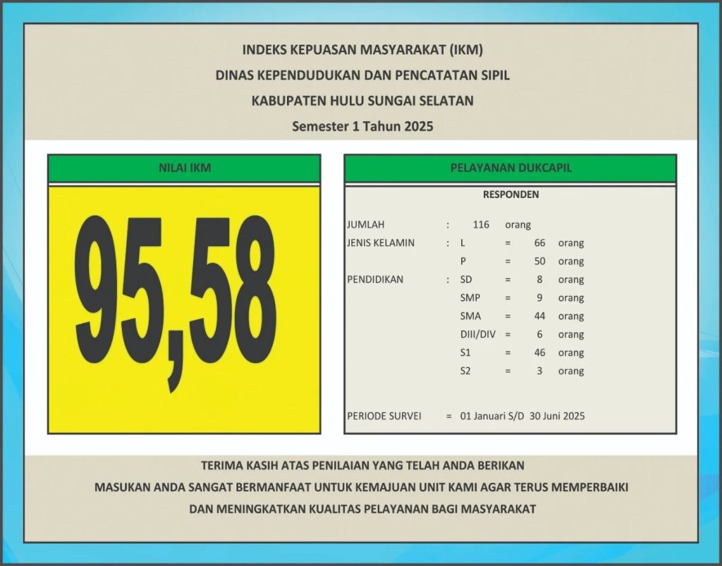 Indeks kepuasan masyarakat (IKM) Dinas Dukcapil Kab. HSS Semester 1 dan Semester 2 Tahun 2025.