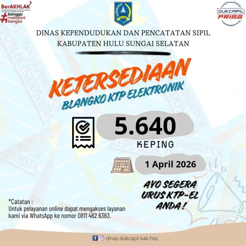 Informasi ketersediaan blangko KTP-el hari Rabu tanggal 1 April 2026 sebanyak 5.640 keping.