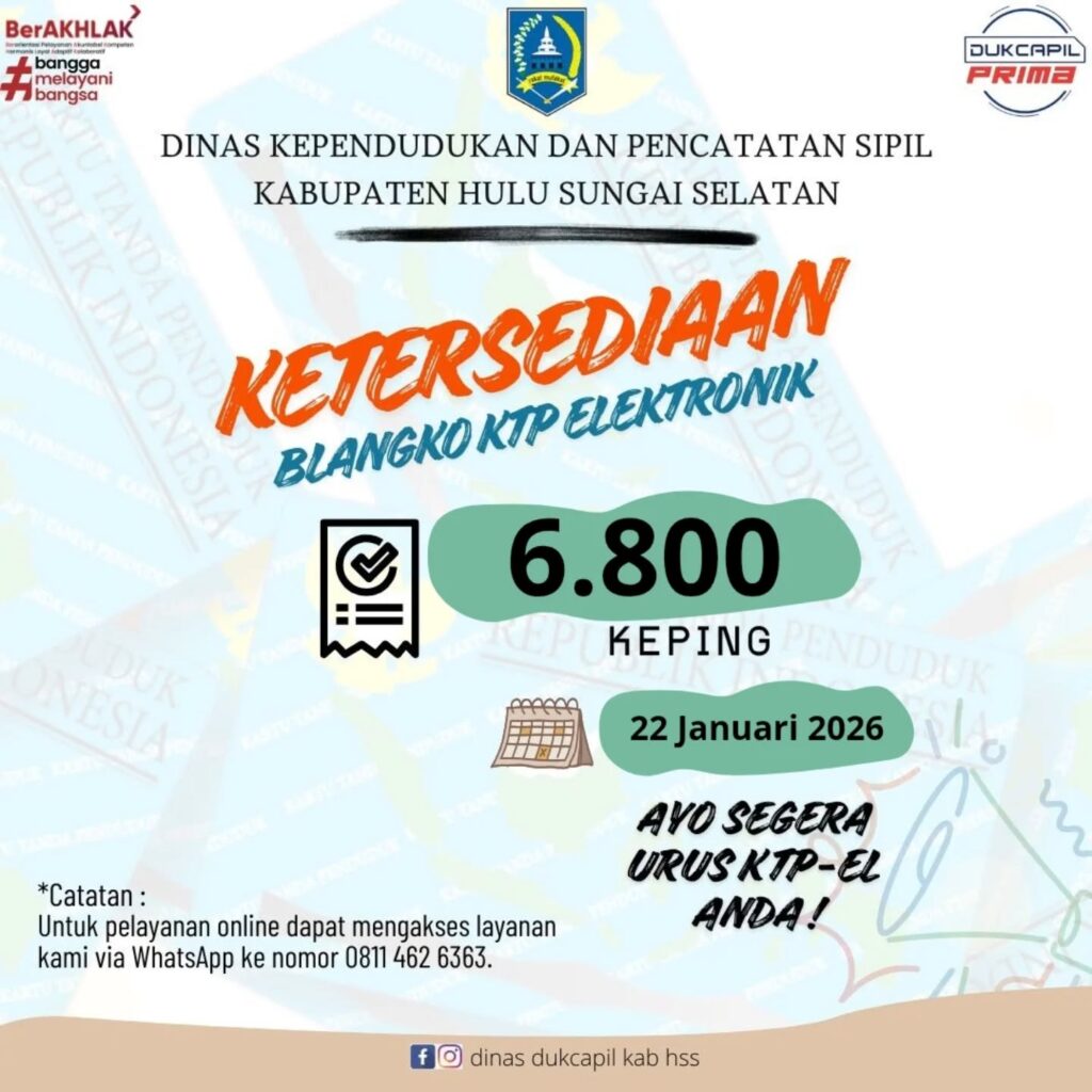 Informasi ketersediaan blangko KTP-el hari Kamis tanggal 22 Januari 2026 sebanyak 6.800 keping.